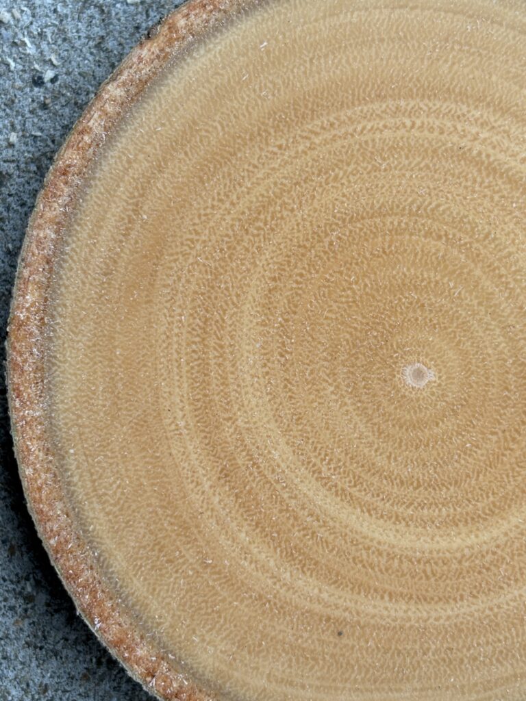 切り口は明るい黄褐色で、年輪がはっきりとしています。