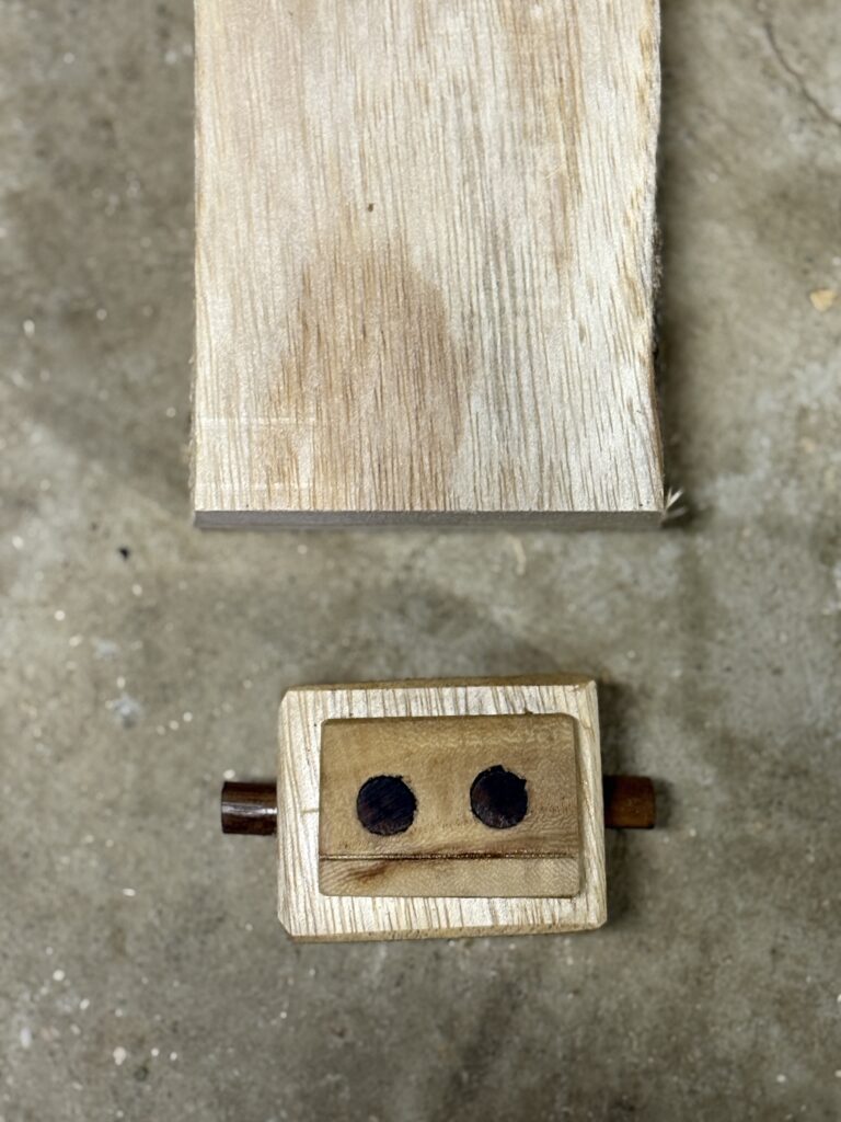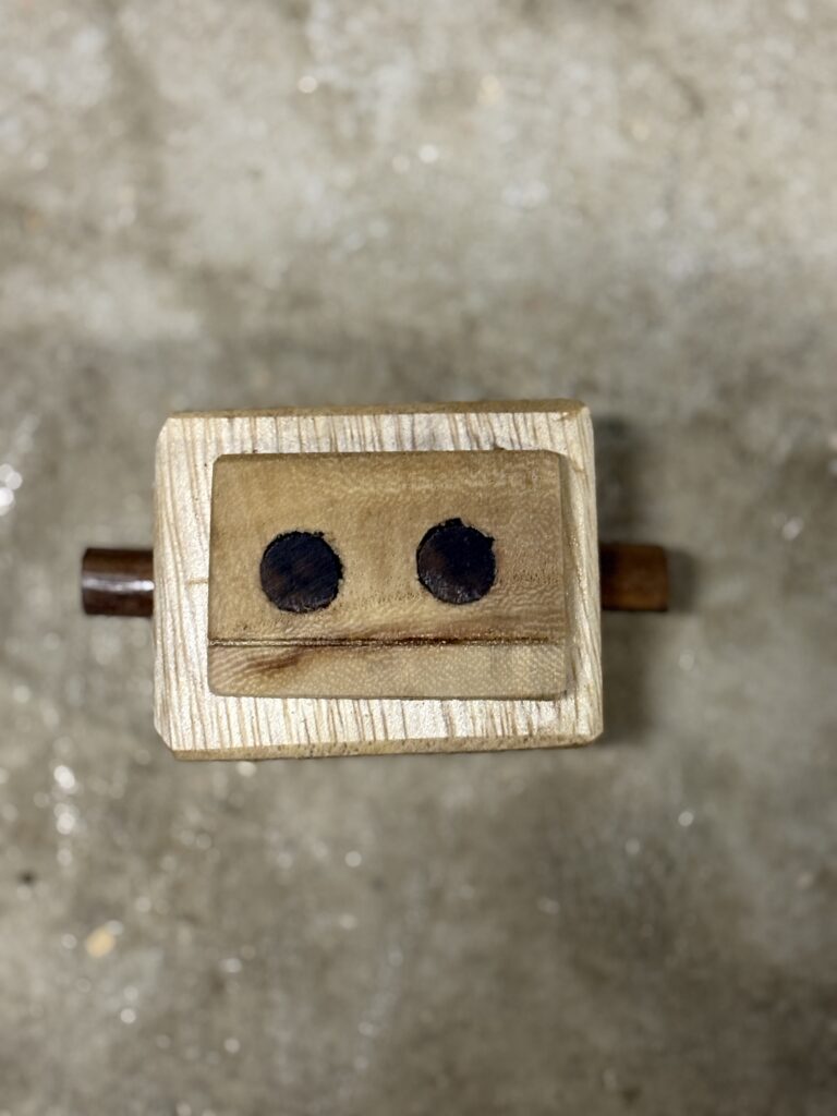 頭の両側に丸棒を通して、目の部分には濃い色の木を埋め込み。